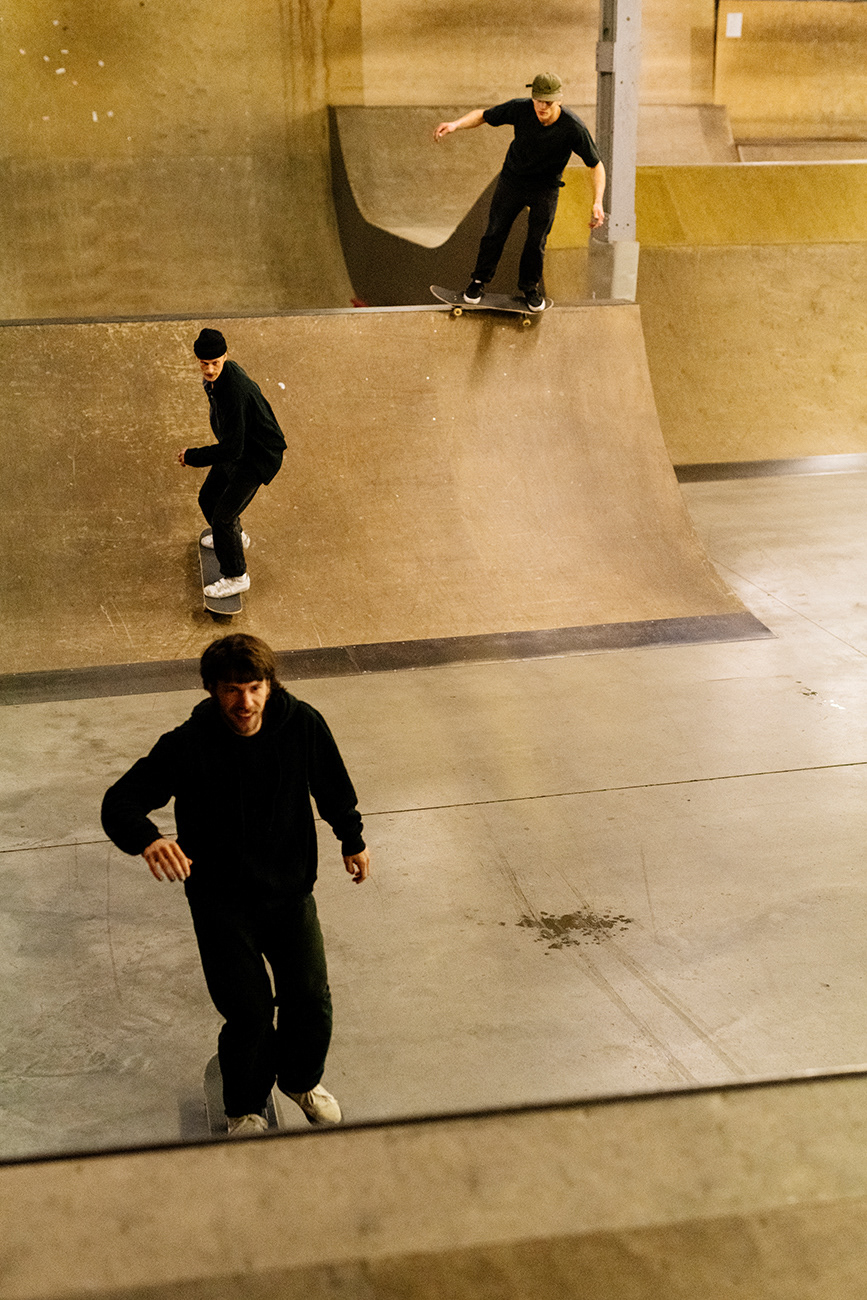 The indoor skate halls, which are mostly built of wooden structures and an improved version of the original urban conditions, make it possible to practise, improve and train the different tricks. Through the repetition of the same thing, the practice of tricks, or the faster sequence of tricks, the rhythmic structures of skating become even more concise.