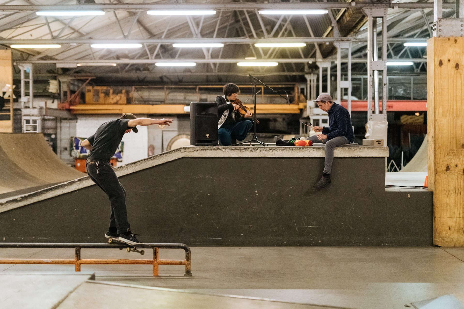 The percussionist Dirk Rothbrust will develop an instrument for this special performance situation, which is expanded by the performance location (the ramps of the skate park acting as resonating bodies) and responds to the special tonal nature of the space and its protagonists: wooden crates instead of drums, tiles on resonating lists (for rubbing and imitating the rolling and grinding noises), metal sheets instead of cymbals in order to pick up the sounds of the skaters and assemble them into rhythms. The violinist Akiko Ahrendt approaches this special musical dialogue partner through extended playing techniques that on the one hand take up parameters that correspond to the logic of the space, such as physical exertion, loop and repetition structures, and on the other hand also take up the special soundscape of the performance space.